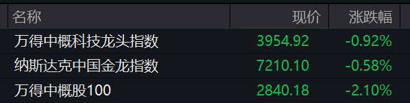 中概股表现弱势,中概科技龙头多数飘绿,万得中概股100指数跌超2%。